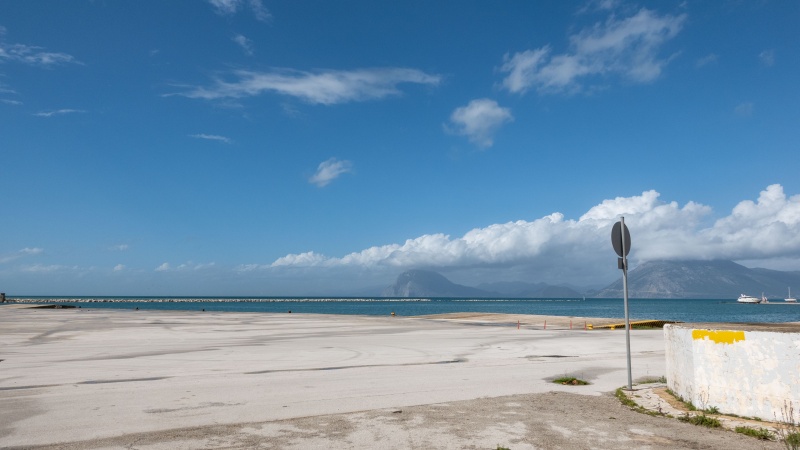Im Hintergrund sieht man das Griechische Festland jenseits des Golfs von Korinth.