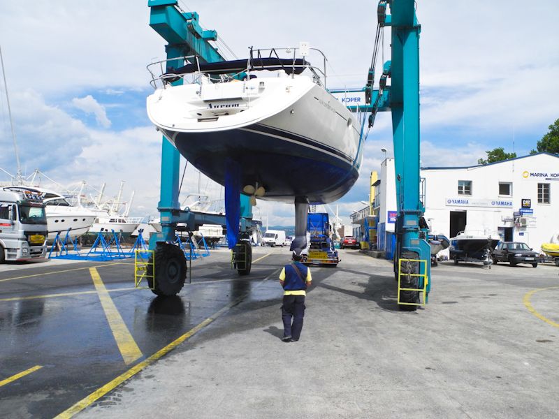 Die Yacht kurz vor dem Verladen im Hafen von Koper
