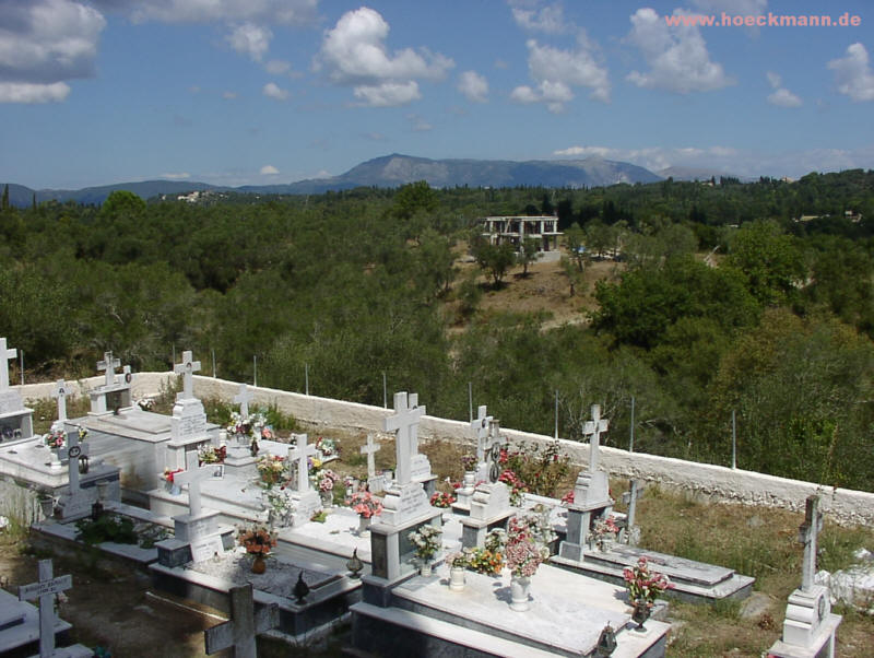 Blick über den Friedhof in Agios Ioannis Richtung Pantokrator