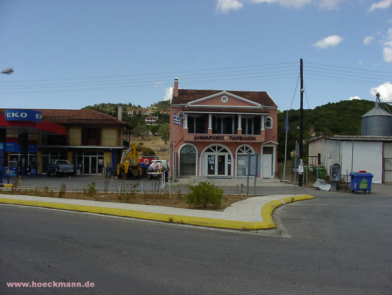 Die Straße nach links führt Richtung Palaiokastritsa, nach rechts geht es zur Inselhauptstadt. Nach hinten geht es nach Vatos und Ermones