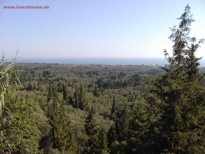 Hinter den ausgedehnten Olivenhainen liegt der Strand von Agios Georgios