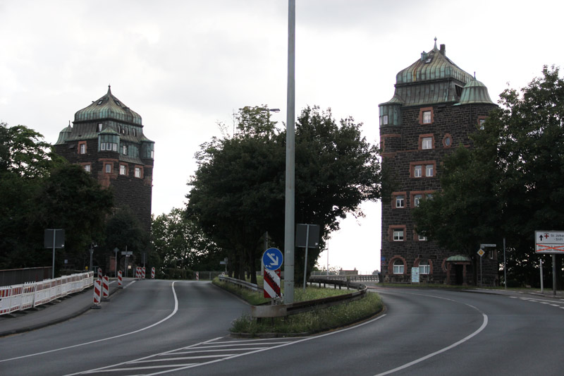 die Brückentürme der Ruhrort-Homberger Brücke in Duisburg von Nordosten