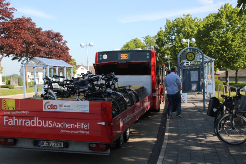 Die Anreise begann in Dortmund mit der Bahn nach Aachen. Von dort nahm ich einen Bus bis zur Umsteigestation Simmerath, von wo ein Bus Richtung Monschau fuhr. Der Bus war gut besetzt, wenn nicht voll und auch der Radanhänger hatte kaum noch Raum für weitere Räder.
