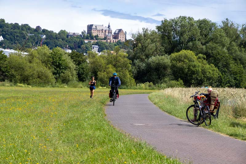 Das Schloss kann man noch aus einigen Kilometern Entfernung über der Stadt thronen sehen. Wie man sieht ist der Radweg gut ausgebaut. Radtour entlang der Lahn - Juli 2020