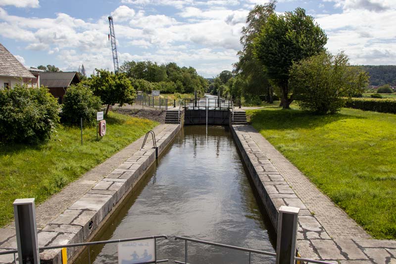 Eine der zahlreichen Lahnschleusen befindet sich bei Oberbiel. Radtour entlang der Lahn - Juli 2020
