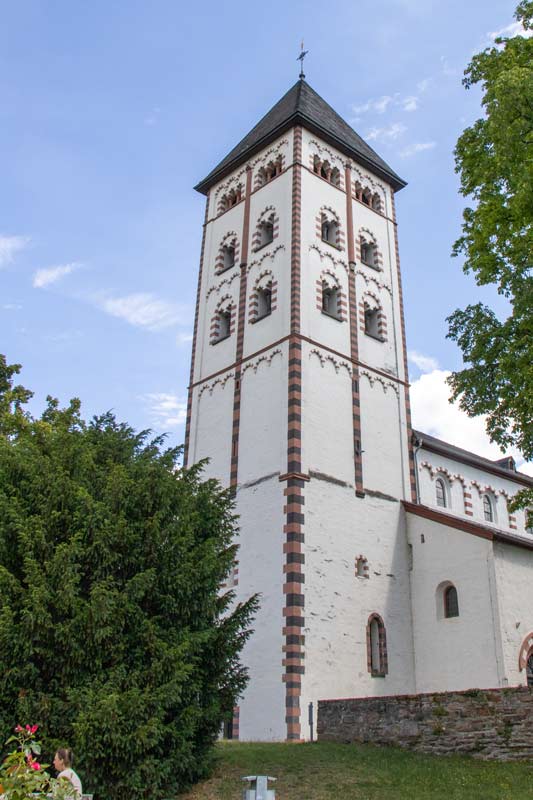 Direkt am Rhein steht diese romanische Kirche. Radtour entlang der Lahn - Juli 2020