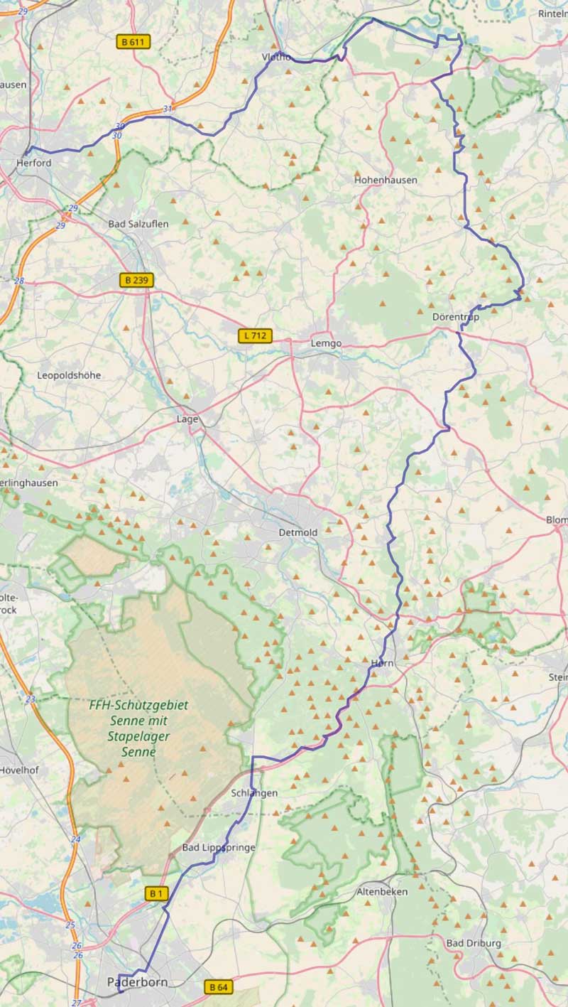 Karte der Radtour von Paderborn über Horn und Vlotho nach Herford