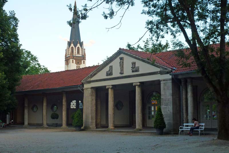 Trinkkuranlage und Turm der Bonifatiuskirche