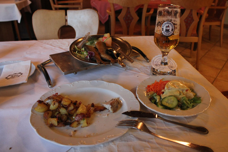 Ich gönnte mir wie an den andern Abenden auch ein landestypisches Fischgericht: gebratene Heringe mit Bratkartoffeln und dazu, wie könnte es anders sein, ein Flensburger (oder zwei).