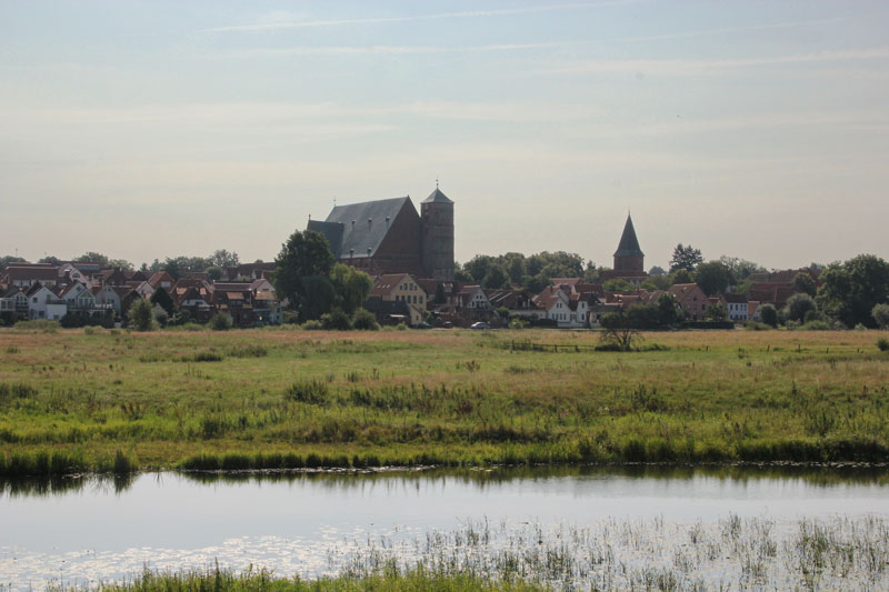 Ein Stadtpanorame, wie man es heute nur noch selten sehen kann. Zur Aller hin fehlt jegliche Bebauung neuerer Zeit, so dass man die Stadt und vor allem die Kirchen als eindrucksvolle Silhouette bestaunen kann. - Weserradtour - Juli 2014