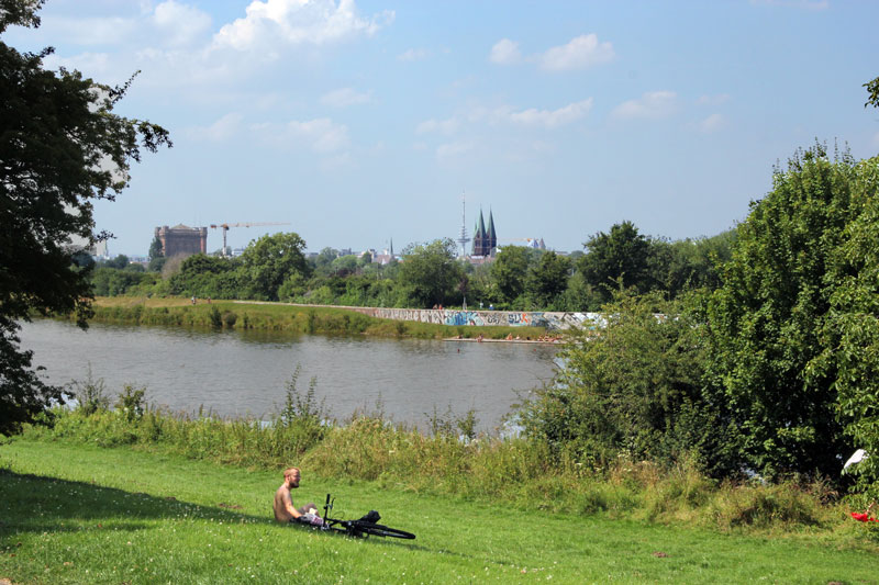 Am gegenüberliegenden Ufer sahen wir ein Freibad. Also hielten wir an und schwammen ein wenig in dem ca. 21 Grad kalten Wasser, was eine herrliche Erfrischung bei mehr als 30 Grad war. - Weserradtour - Juli 2014